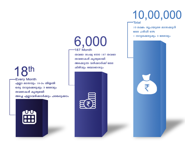 NB: കുറിയിലെ വരിക്കാരുടെ എണ്ണമനുസരിച്ച് സമ്മാനങ്ങളില് മാറ്റം ഉണ്ടായിരിക്കും. ബോണസ്സ് സമ്മാനങ്ങള്ക്ക് വരുന്ന കേന്ദ്ര സംസ്ഥാന നികുതികള് വരിക്കാര് വഹിക്കേണ്ടതാണ്.